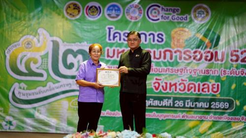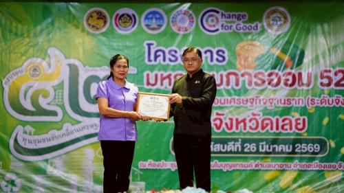 นางปทิตตา พรหมพุทธา พัฒนาการอำเภอภูกระดึง พร้อมด้วย นายปริญญา เสือสาวะถี นักวิชาการพัฒนาชุมชนชำนาญการ นางสาวปณิชา วสุวัตน์ นักวิชาการพัฒนาชุมชนปฏิบัติการ และนางสาววัชรี บุญพิทักษ์ นักวิชาการพัฒนาชุมชนปฏิบัติการ เข้าร่วมกิจกรรมพร้อมกับนำกลุ่มออมทรัพย์เพื่อการผลิตบ้านผาสามยอด ตำบลผานกเค้าเข้าร่วมรับใบประกาศนียบัตรกลุ่มออมทรัพย์เพื่อการผลิตดีเด่น ประจำปี 2569